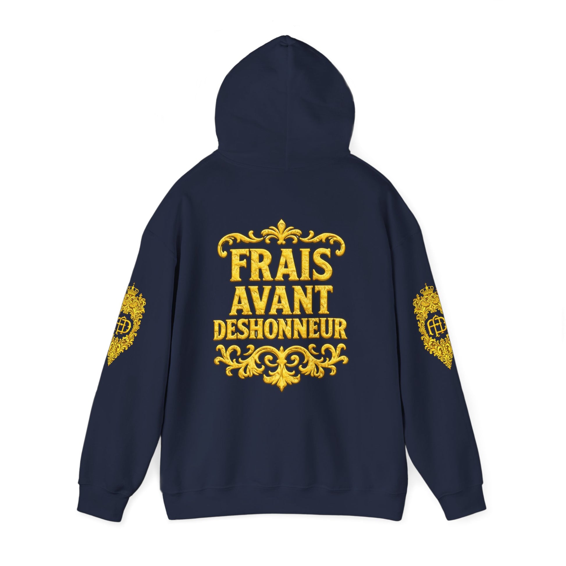 This cozy hooded sweatshirt blends classic comfort with baroque-inspired graphics for a look that feels both nostalgic and bold. Soft, medium-weight fabric provides warmth without bulk; the double-lined hood and color-matched drawcord add durability and a finished feel. Ornate gold crest artwork decorates the chest and sleeves, while a larger typographic crest—"FRAIS AVANT DESHONNEUR"—sits on the back, giving the piece a statement-making, vintage-European aesthetic. Wear it over jeans or layered under a coat; it brings a confident, slightly rebellious elegance to cool evenings and laid-back gatherings.