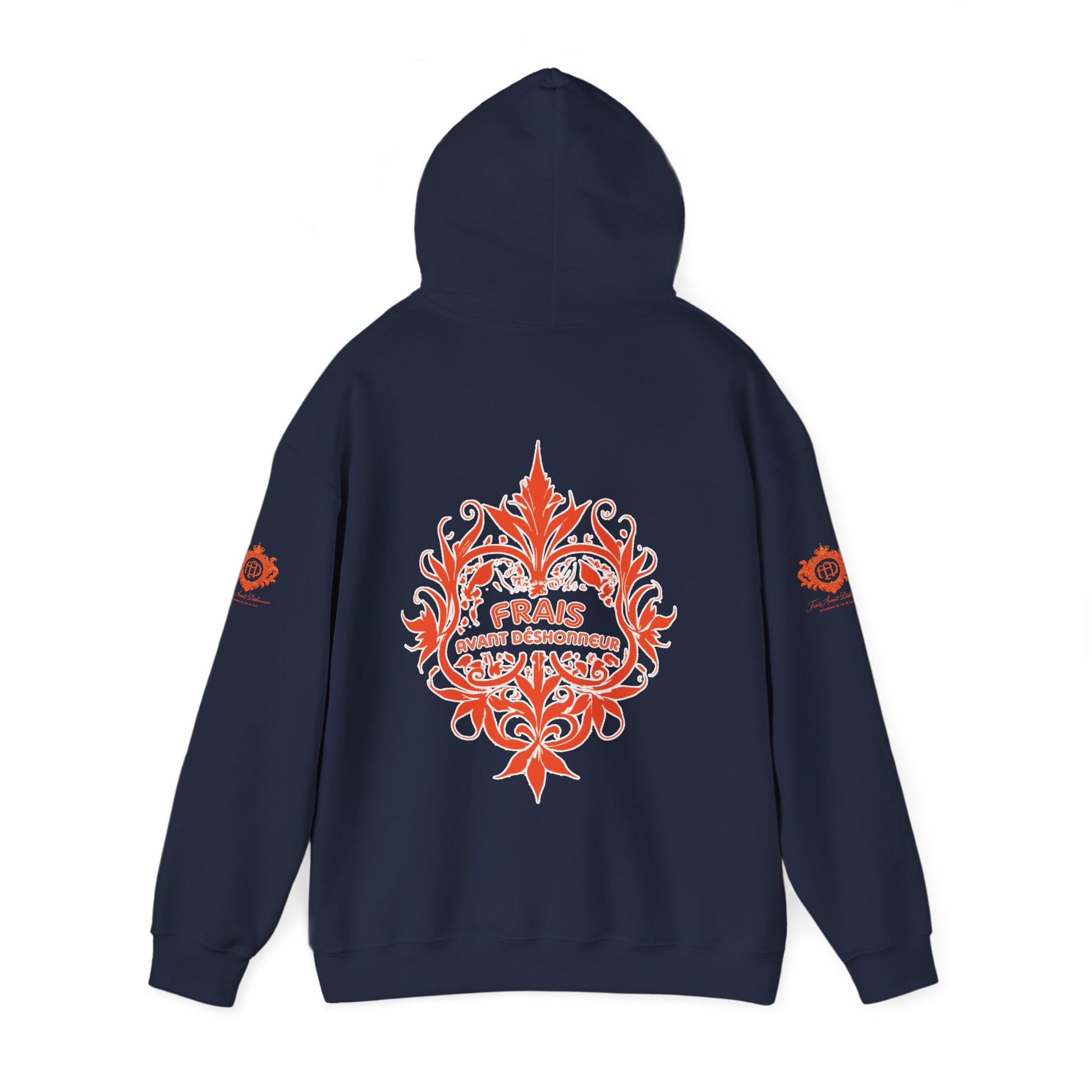This unisex heavy blend hooded sweatshirt is relaxation itself. Made with a thick blend of cotton and polyester, it feels plush, soft and warm, a perfect choice for any cold day. It features an Orange Frais Avant Déshonneur mono logo on the front as well as our signature “Royalty” logo on the back and each sleeve for an added touch.