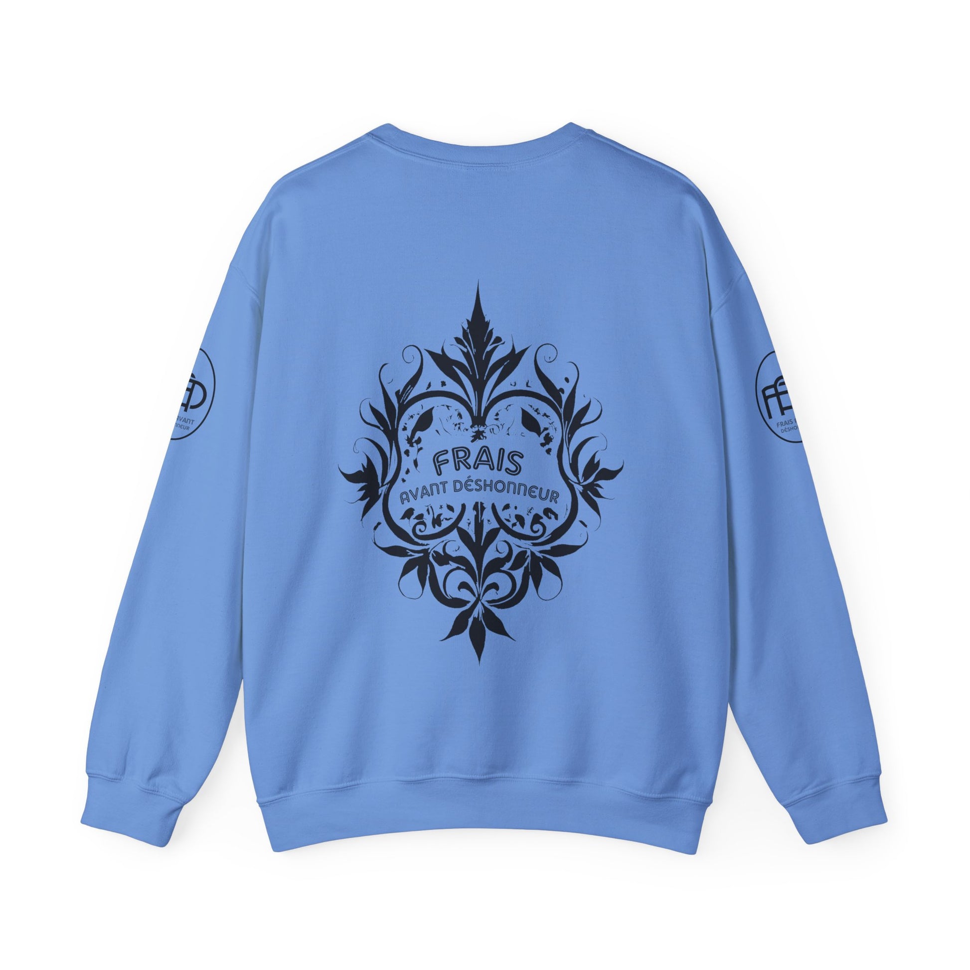 Frais Avant Déshonneur sweatshirt featuring our signature "L’éléphant dans la pièce" logo. The collar is ribbed knit, so it retains its shape even after washing. There are no itchy side seams on these sweaters.